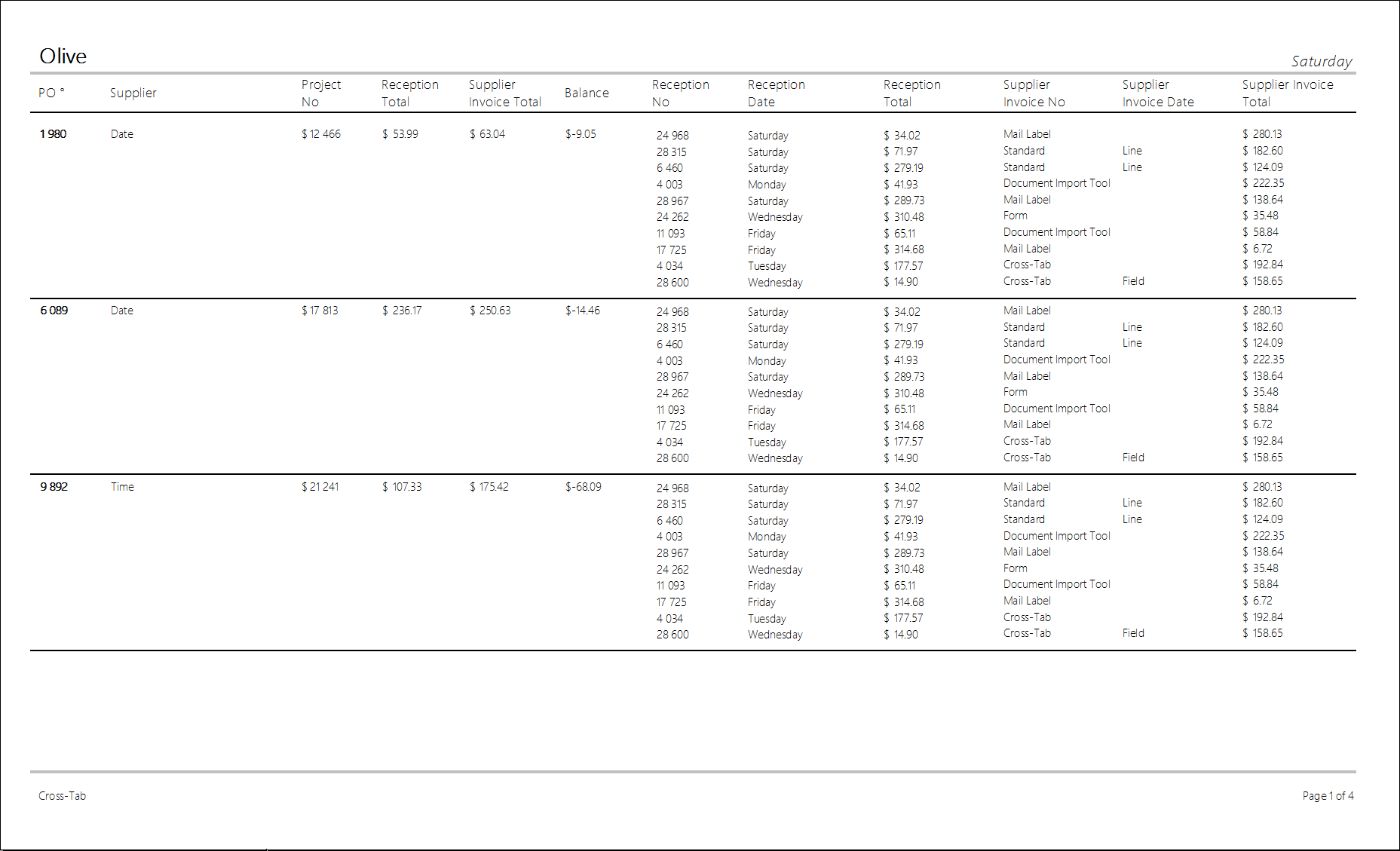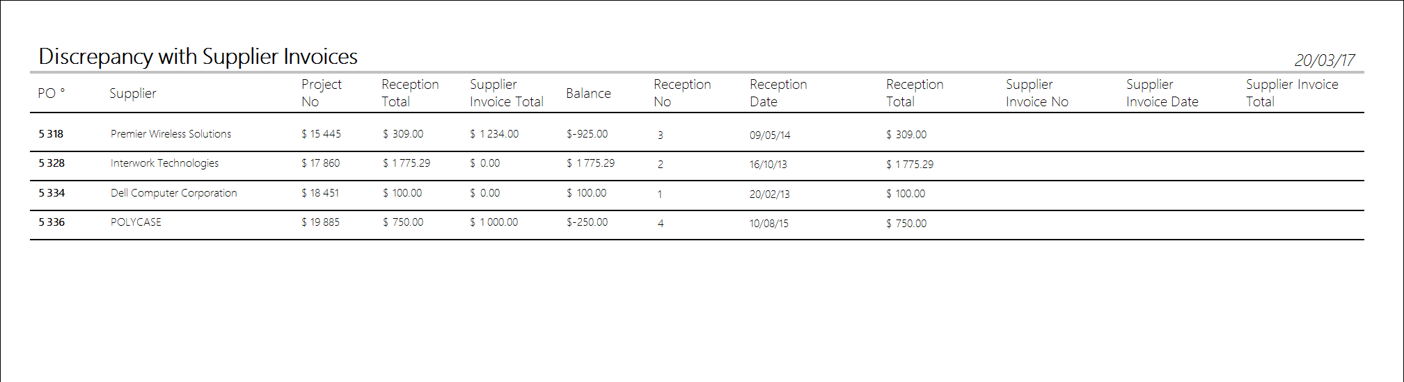 Discrepancy with Supplier Invoice Report This report shows up all differences in between items invoiced and items received.
