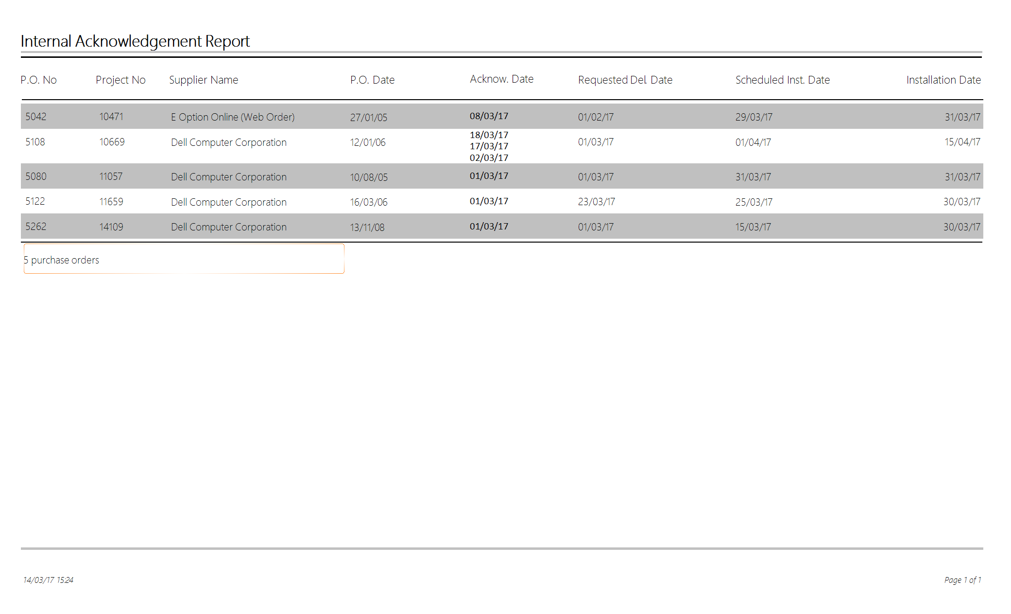 Internal Acknowledgement Report This report gives you a list of the shipping lists given to you from your suppliers. This report is used to help with scheduling installations and confirming orders from your different suppliers.