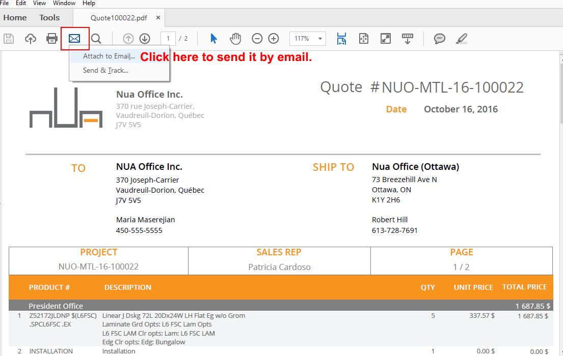 Once the report will be opened, you can review your quote the way your customer will see it. To print or send it by email, bring your mouse down the PDF viewer and a toolbar will appear. Click on the printer icon.