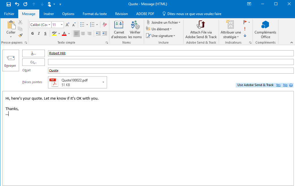 Outlook will open and automatically attach your file to the email. Enter the email address of your customer, a quick message and click on Send. Sorry for the french version of Outlook here !