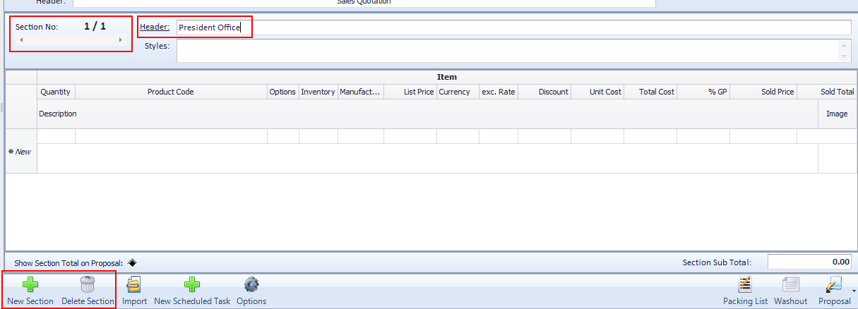 Info is the main subtab. It’s the place where we specify the customer, contact, salesperson, etc. It’s also where we’ll insert items inside as many sections we want to. In this example, I simply clicked on the New button (bottom left) and haven’t filled anything yet.