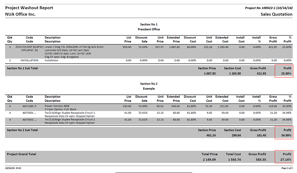 In this example, we can see the average %GP of the first section is 25%, the second one is 34.99%, for a total %GP of 27.14%. If we’re satisfied by the incoming results, then we’re ready to print and/or email our quote !