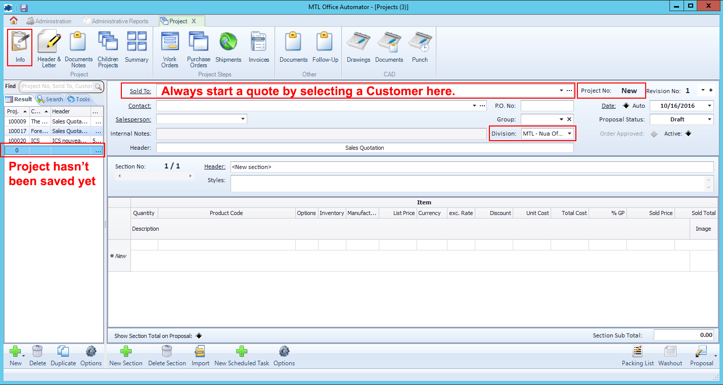 3. Don’t change the Division menu value (e.g.: MTL). Otherwise, you might not see your quote anymore, since most users don’t have the access to other company’s division. If you change this value by mistake, tell us so we can fix this.