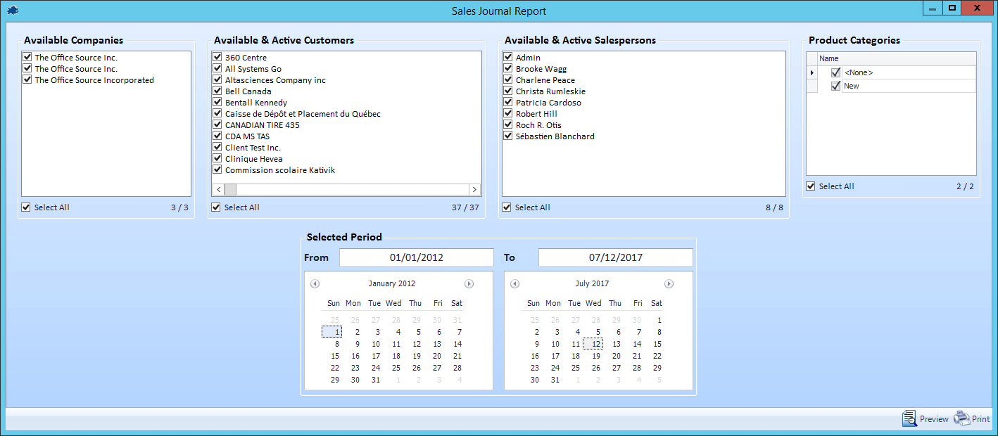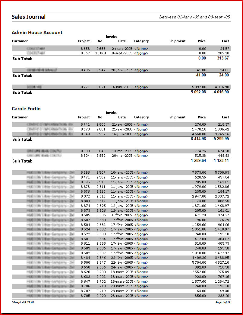 Sales Journal Report Sales (Invoicing) completed by salesperson, by customer, by project, and by item category.